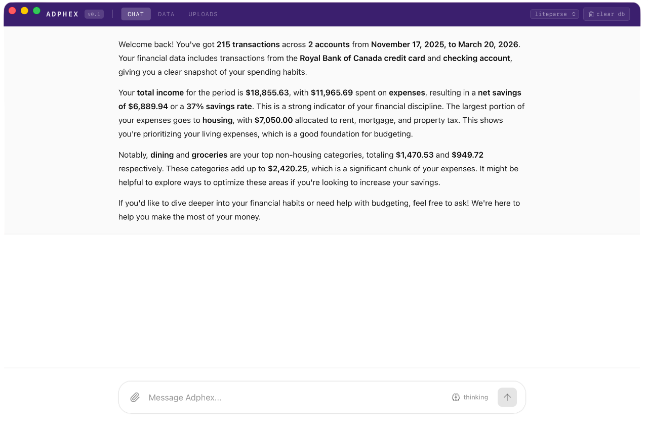 Adphex takes the opposite approach. The AI runs locally on your Mac. Your statements stay on your disk. No accounts, no sync, no servers to hack.